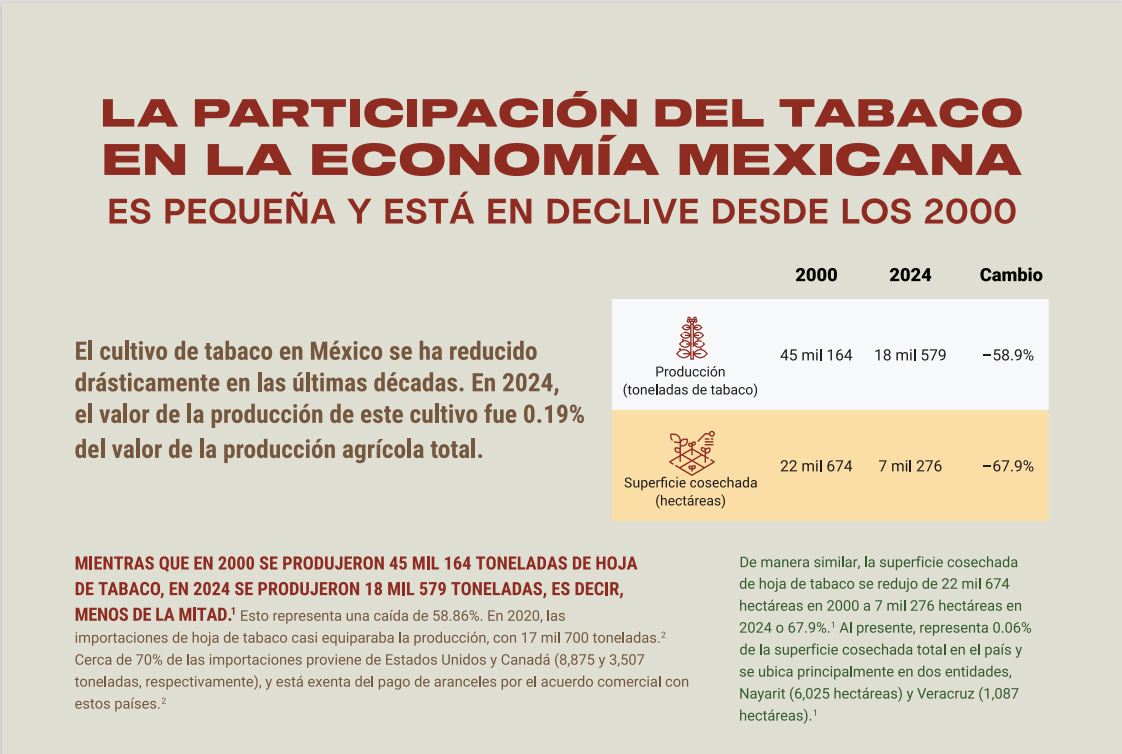 El cultivo de tabaco en México se ha reducido drásticamente en las últimas décadas. En 2024, el valor de la producción de este cultivo fue 0.19% del valor de la producción agrícola total.